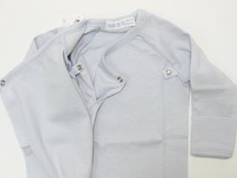 - 前面はスナップボタンで開くあわせタイプで、赤ちゃんの脱ぎ着をさせやすいです。