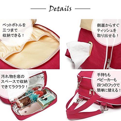 - 手提げ、肩掛け、リュック、更にキャリーバッグとしても、ベビーカーに掛けても便利な5WAY仕様!シーンに合わせて様々な使い方が可能!