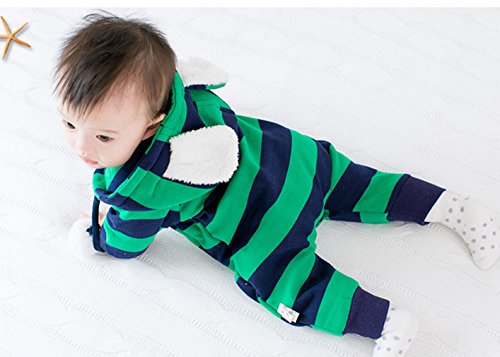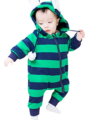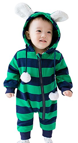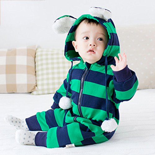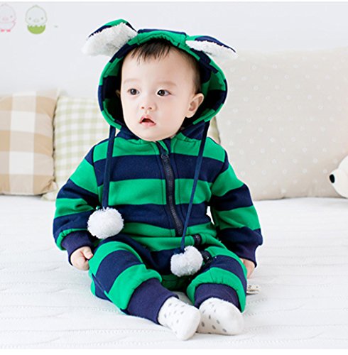 (コ-ランド) Co-land ベビー服 ロンパース 赤ちゃん カバーオール 新生児 長袖 フード 耳付き ボーダー柄 ポンポン 着ぐるみ 男の子 秋冬防寒 出産祝い 可愛い グリーン 80