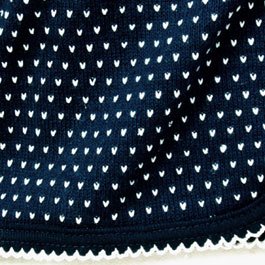 - 色は濃いネイビーブルーに白の糸で、v字の柄編みと縁飾りです。