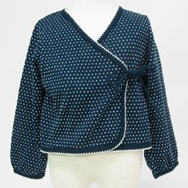 ■スイスSelanaの上品なオーガニックコットン&シルクのあわせタイプのカーディガンです。 ◆このカーディガンは前はあわせタイプでヒモで2箇所結ぶようになっています。何にでもあわせやすく、春夏秋の3シーズン使えますので、1枚あると季節の変わり目などに温度調節ができますので重宝です。 色は濃いネイビーブルーに白の糸で、v字の柄編みと縁飾りです。 ◆赤ちゃんにシルク?!と驚かれる方も多いですが、シルク特有の吸湿性や保温性や天然の抗菌性があり、ヨーロッパでは赤ちゃん衣類によく使われる素材です。 また、オーガニックコットンとの混紡なので肌触りもとてもソフトでお洗濯も簡単で、ネット使用デリケート洗いで洗濯機で洗えます。(せっかくの素材なので洗濯洗剤も無化学薬品系がおすすめです。) ■商品番号 S-5210-01-3813 ■サイズ ◆着丈(背中心) 身幅(平置きでの横幅) 袖丈(肩~袖口) ◆サイズ80 = 着丈26cm 身幅28cm 袖丈27cm ◆サイズ86 = 着丈28cm 身幅28cm 袖丈30cm ◆サイズ92 = 着丈30cm 身幅29cm 袖丈33cm ■オーガニックコットン53%シルク47% Selana社(スイス)製