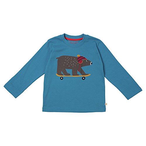 - トップスはブルー地に木に帽子をかぶってスケートボードに乗るクマのプリントがついています。