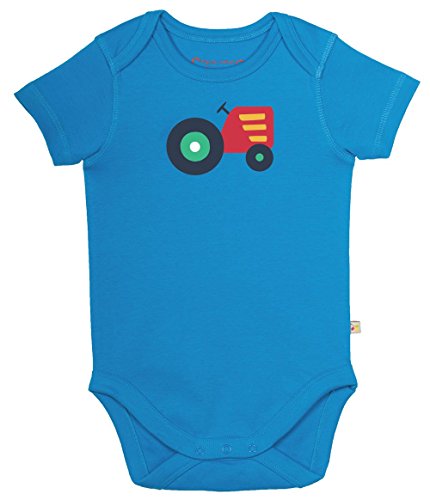 - ブルー地に胸にトラクターのプリントのついている半袖ボディースーツです。