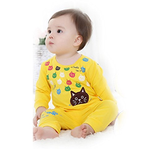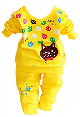 (ラボーグ)La vogue カジュアル ベビー服 2点セット 長袖トップス ロングパンツ 可愛い猫柄 丸首Tシャツ 長ズボン 新生児服 女の子 男の子 春秋普段着 イエロー 90サイズ