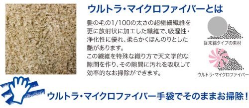 皮膚にふれても安全!髪の毛の1/100の太さの超極細繊維を更に放射状に加工した繊維で、吸収性、浄化性に優れ、柔らかくほんのりとした艶があります。この繊維を特殊な織り方で天文学的な隙間を作り、その隙間に汚れを吸収して効率的なお掃除ができます。そのまま手袋として使用してても、手触りがよく暖かで、思わず頬ずりしたくなるやわらかさです!!