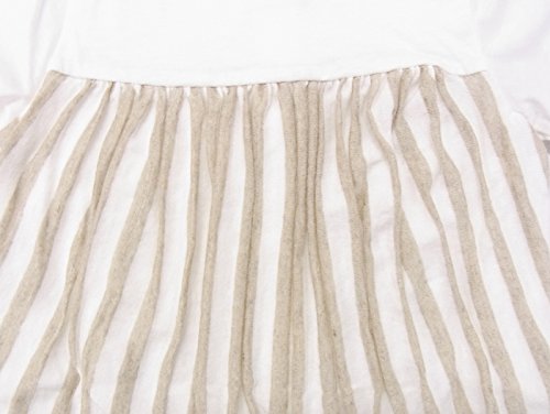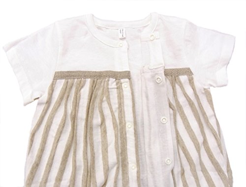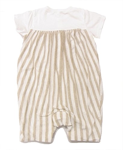 やわらかなオーガニックコットンとリネンの天竺生地で、ギャザーをたっぷり寄せてショートオールをつくりました。 グレーとホワイトのストライプが新鮮。グレコ部分は気持ちよいオーガニックコットン100%の天竺で涼しく仕上げています。 シルバーのリボンがポイントです。 70cm:着丈41cm/身幅25cm/袖丈5cm