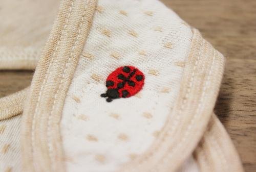 - マジックテープで留めるタイプのスタイなので、取り外しが簡単です。ポイントのてんとう虫刺繍が可愛いです。