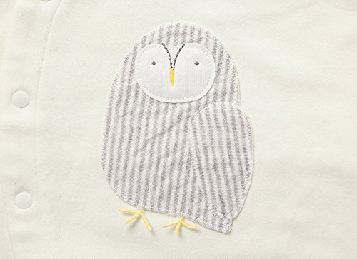 安心感のある40/-スムース生地にきょとんとした表情のふくろうを刺繍した2WAYドレスです。 左袖にはさりげなくふくろうの足跡が・・・!袖口は折り返すとミトンとして使えるデザインです。 ふくろうの足は縫い付けず、パタパタとさせています。 男の子にも女の子にもかわいいモチーフ。 酉年の2017年生まれの赤ちゃんに、ギフトにもおすすめです。 素材 オーガニックコットン100% サイズ 50-60cm カラー ナチュラル 日本製 生地:和歌山県 縫製:新潟県 着丈 48cm 身幅 27cm 裄丈 29cm 天幅 9cm 袖口幅 7cm 股下 14cm