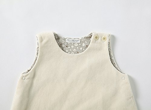コーデュロイよりもふっくらとしたモケットを開発し、しっかりとあたたかなジャンパースカートつくりました。 さりげなく見える裏地のプリントが愛らしいポイントです。 オーガニックコットンのナチュラルカラーとヤクコットンの濃いグレーの2素材展開です。 「太陽のそばかすについて」 ナチュラルは原綿そのままの生成り色なので、生地にはポツポツと茶色い斑点が残っている場合がございます。 これは糸にする段階で除ききれなかった綿花の葉や茎の残り で、害はございません。 お洗濯を繰り返すごとに減っていきます。私たちはこの斑点を「太陽のそばかす」と呼んでいます。 太陽をたっぷり浴びて育ったオーガ ニックコットンの誇りあるそばかすです。