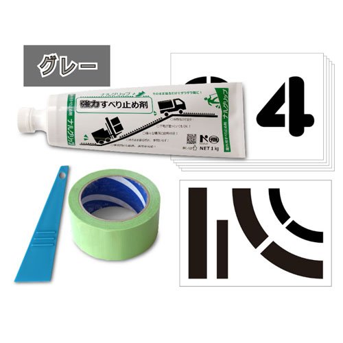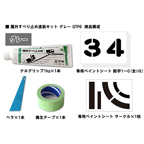 ●ペイントシートを付属したすべり止め剤 ナルグリップの塗装キットです。駐車場のラインや番号(1~0)をペイントできます。●商品セット内容】ナルグリップグレー1kg×1本、ペイントシート6枚(数字5枚、サークル)、ヘラ1本、養生テープ1巻【注意事項】●塗布後は24時間以上、十分乾燥させて下さい。特に梅雨時、冬期、湿気の多い場所は出来るだけ長く乾燥させて下さい。●素足での歩行には向いていません。主に履き物を履いて歩行する場所や車両のすべり止めとしてご利用下さい。●冬期の保管時や塗布後の乾燥前に凍結すると使用不可能となります。●お客様ご都合でのご返品は不可となりますのでご了承下さい。
