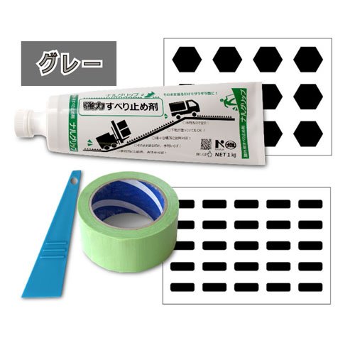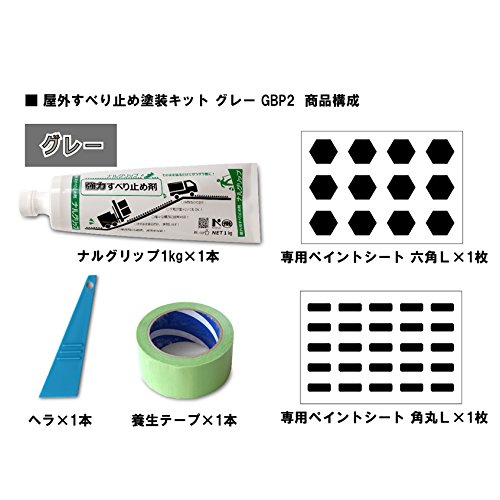 ●ペイントシートを付属したすべり止め剤 ナルグリップの塗装キットです。パターン模様を手軽に塗布できます。●商品セット内容:ナルグリップグレー1kg×1本、ペイントシート2枚(六角L、角丸L)、ヘラ1本、養生テープ1巻【注意事項】●塗布後は24時間以上、十分乾燥させて下さい。特に梅雨時、冬期、湿気の多い場所は出来るだけ長く乾燥させて下さい。●素足での歩行には向いていません。主に履き物を履いて歩行する場所や車両のすべり止めとしてご利用下さい。●冬期の保管時や塗布後の乾燥前に凍結すると使用不可能となります。●お客様ご都合でのご返品は不可となりますのでご了承下さい。
