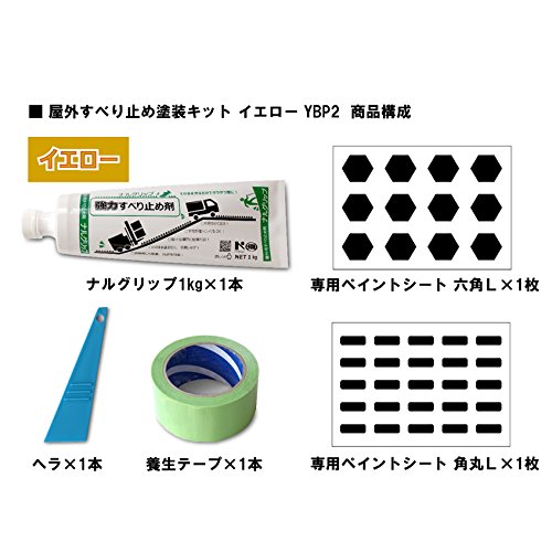 ●ペイントシートを付属したすべり止め剤 ナルグリップの塗装キットです。パターン模様を手軽に塗布できます。●商品セット内容】ナルグリップイエロー1kg×1本、ペイントシート6枚(六角L、角丸L)、ヘラ1本、養生テープ1巻【注意事項】●塗布後は24時間以上、十分乾燥させて下さい。特に梅雨時、冬期、湿気の多い場所は出来るだけ長く乾燥させて下さい。●素足での歩行には向いていません。主に履き物を履いて歩行する場所や車両のすべり止めとしてご利用下さい。●冬期の保管時や塗布後の乾燥前に凍結すると使用不可能となります。●お客様ご都合でのご返品は不可となりますのでご了承下さい。