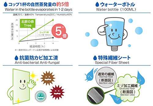 電気を使わないECOな加湿器です。 オフィスデスク、ベッドサイド、病院、小さなお子様のそばなどにも安心してお使い頂けます。 【コップ1杯の自然蒸発量の約5倍】本品1つでコップ1杯の自然蒸発量のおよそ5倍の水が蒸発します。(温度25℃湿度40%時) 【ウォーターボトル搭載】ウォーターボトルは、給水回数を減らすだけでなく、「コポッ」と気泡があがるので視覚的にもうるおいます。【抗菌防カビ加工済】フィルターには抗菌防カビ処理が施されており、カビや細菌の増殖を防ぎます。 【特殊繊維シート】ミゾを施した特殊な繊維を採用することで、水を表面に保持しやすくし、水分を多く蒸散させます。【デザイン】「北欧の自然」をイメージしたストーリーのある繊細なデザイン。