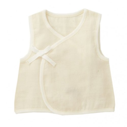 やわらかなダブルガーゼのノースリーブ肌着です。夏は一枚で、冬はベストのように重ねて、と温度調整に年間通して重宝する形です。ナチュラルとホワイトの配色で、ベビーのピュアなイメージを表現しています。 縫い代はすべてフラットシーマで肌あたりをやさしく仕上げています。お洗濯:お洗濯には合成洗剤は避け、出来るだけ化学物質の入っていない洗剤をお使いください。塩素系漂白剤や蛍光増白剤などのご使用はお控えください。洗濯ネットに入れてお洗濯していただくと、オーガニックコットンの風合いを長くお楽しみいただけます.高温乾燥機は使用せず、なるべく陰干しをおすすめします。