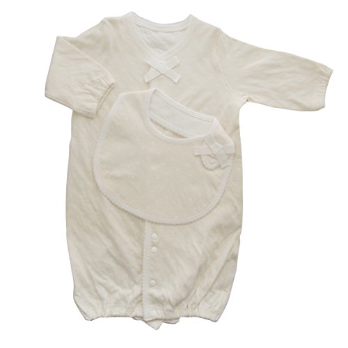 オーガニックコットン100%のナチュラルのベースにホワイトのドット柄が入ったエアニットの2wayドレスとスタイのセットです。白のリボンがアクセントになっています。男の子も女の子もかわいく着られるシンプルなデザインです。サイズ:50-60cm。カラー は、ナチュラル×ホワイト。ご出産祝い、ご準備に。オーガニックコットンの2wayドレスは、バタバタ足の動く元気な赤ちゃんでも、お母さんが着せやすいように工夫がしてあります。それはボタンの掛け違いがにならないよう、股の割れ目のプランサーだけ、内側をグレー色にするというもの。スタイは、白のリボンとピコがかわいいポイントになっています。サイズは、たて28cm×よこ20cm。カラーは、ナチュラル×ホワイト。日本製(生地:和歌山県、縫製:新潟県)。オーガニックコットンとは有機栽培綿のことで、化学肥料の他、殺虫剤、除草剤などの農薬を3年間使わない農地で栽培された有機栽培コットン(綿花)のことです。オーガニックコットンのお手入れ:お洗濯には合成洗剤は避け、出来るだけ化学物質の入っていない洗剤をお使いください。塩素系漂白剤や蛍光増白剤などのご使用はお控えください。洗濯ネットに入れてお洗濯していただくと、オーガニックコットンの風合いを長くお楽しみいただけます。同じホワイトドットのベスト60-70cmもございます。