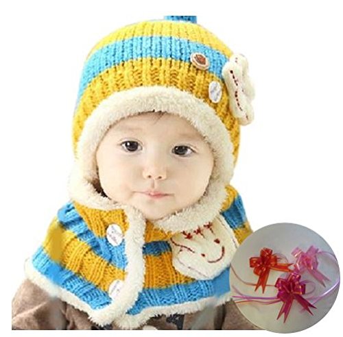 (GOLDEN EGGS)選べる4色 ニット 帽子&マフラー セット リボン付き キッズ 子供用 誕生日 お祝い プレゼント 防寒 帽子 (黄色&水色)