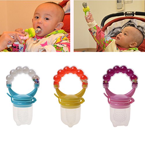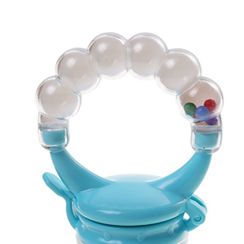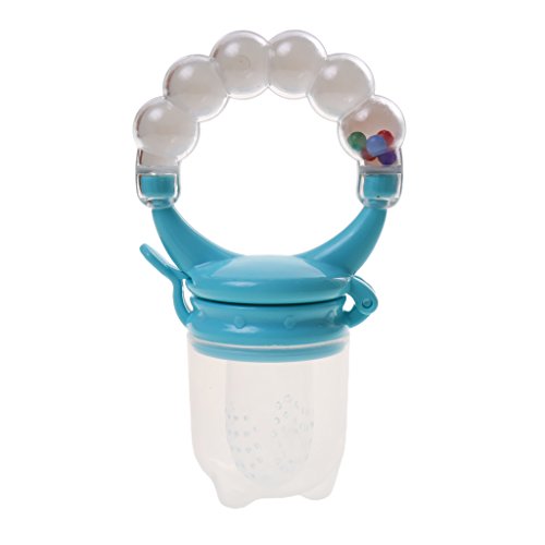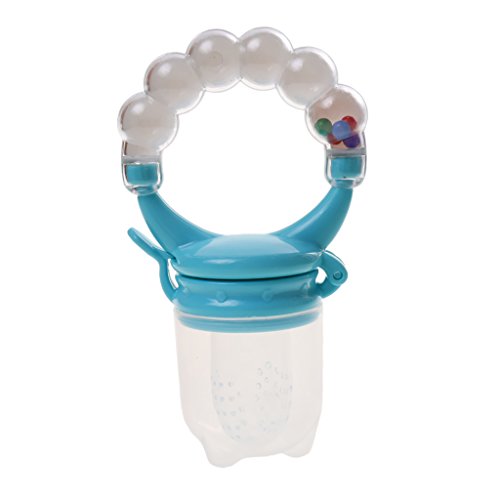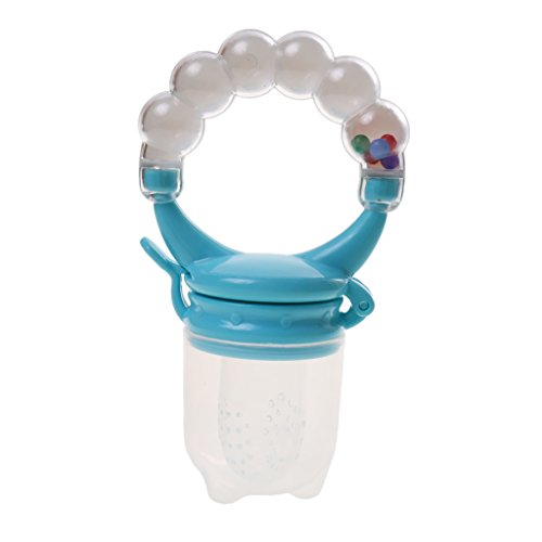 赤ちゃんが食べ物を楽しむためにシリコーンストレーナネットを吸うためにハンドルを保持します。