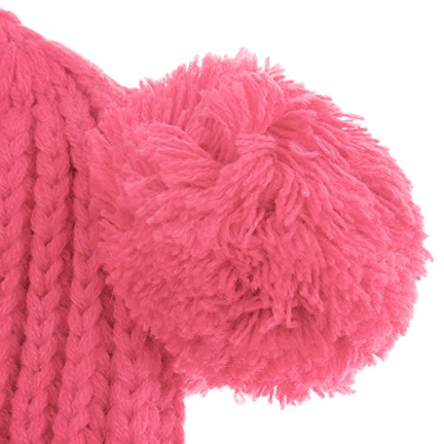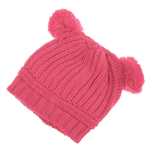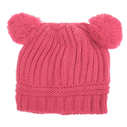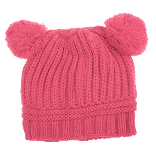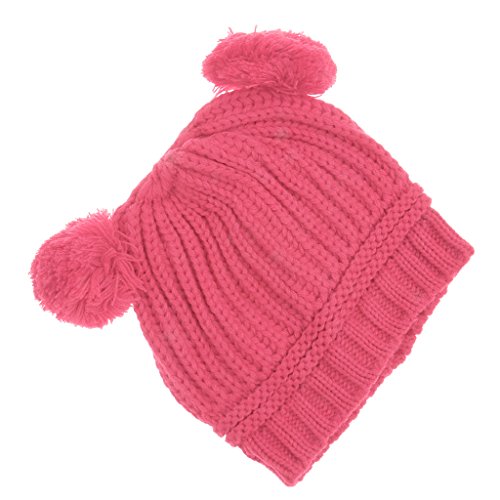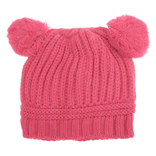 赤ちゃん キッズ 冬 ビーニー かぎ針 編み ニット 暖かい 帽子 二つのボール 可愛い キャップ ボンボン耳付 全5色 - ピンク