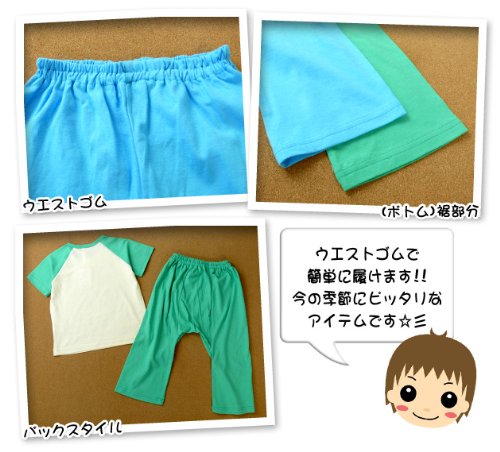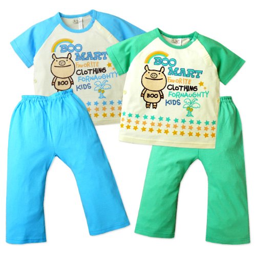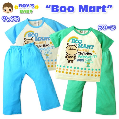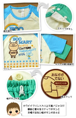 【パジャマ】【男児ベビー】“Boo Mart/ブーマート”プリント入り お腹が出ない脇ボタン付き上下組パジャマ (2グリーン/80cm)