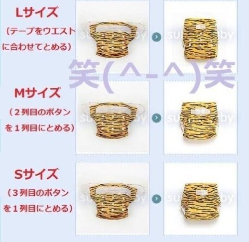 オムツの大きさ(S.M.L)に調整したい時には2列目の三つのボッタン或いは3列目の三つのボッタンを1列目のボタンにかけて調整できます。