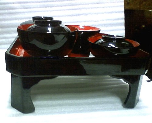 - 仕様:お膳25.0cm×25.0cm×10cm(高さ)、飯椀φ10.5cm×6.0cm(高さ)、汁椀φ9.3cm×4.0cm(高さ)、高つきφ8.8cm×5.0cm(高さ)、平椀φ10.0cm×4.6cm(高さ)、つぼ椀φ7.1cm×4.2cm(高さ)