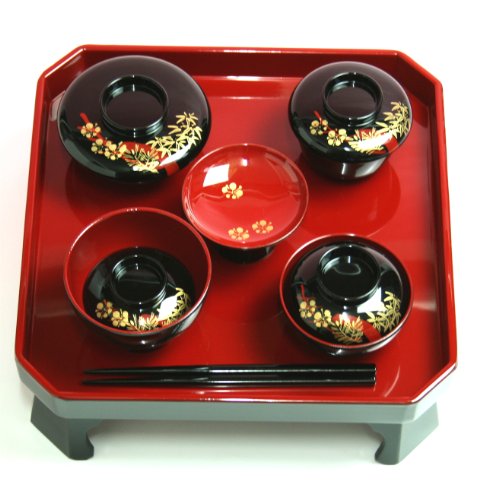 - お膳26.5cm×26.5cm×高さ8.5cm 飯椀φ8.5cm×6.0cm 汁椀φ8.0cm×高さ4.0cm 高つきφ7.0cm×4.0cm 平椀φ10.0cm×高さ3.8cm つぼ椀φ8.5cm×高さ4.5cm