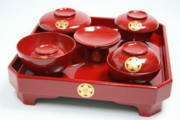 - 木粉樹脂形成加工品に漆を塗って仕上げています。 お膳:26.5cm×26.5cm×5.5cm 飯椀:φ10cm×6.0㎝(高さ)汁椀:φ9.3cm×4㎝(高さ)高つき:φ7.8cm×4.6cm(高さ)平椀:φ12.0cm×4.6cm(高さ)つぼ椀:φ8.5cm×5.5cm(高さ)φ8.5cm×7.0cm(高さ)