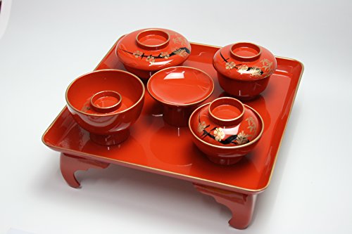 - お膳25.5cm×25.5cm×高さ8cm 飯椀φ8.5cm×6.0cm 汁椀φ8.0cm×高さ4.0cm 高つきφ7.0cm×4.0cm 平椀φ10.0cm×高さ3.8cm つぼ椀φ8.5cm×高さ4.5cm