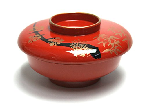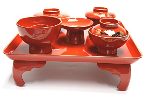 - 【セット内容】お膳、平椀、飯椀、汁椀、つぼ椀、高つき、箸。 縁に金をあしらい、器には松竹梅が描かれています。