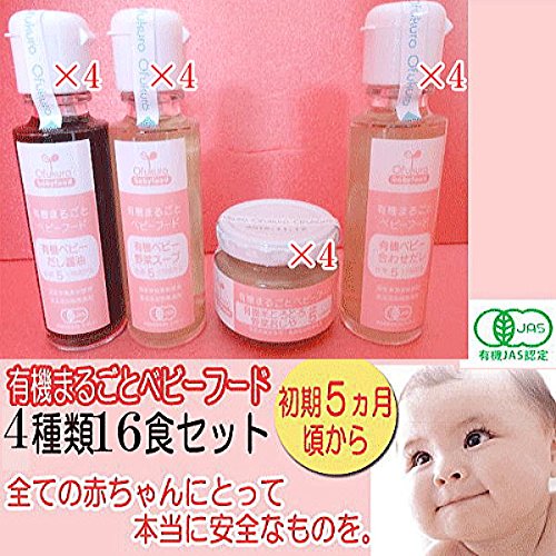 全国の有機米、有機野菜、有機果物など、素材全有機栽培生産者と提携で、素材を確保しています。赤ちゃんの成長に合わせて、有機米おもゆ、有機米とろとろおかゆ、つぶつぶおかゆ、と米からじっくり煮込んでつくり上げています。有機大豆は甘皮を手作業で取り、十分素材を煮詰めて作り上げています。調味料も全て、有機みそ、有機醤油、天然だしを使用しています。コースターチなども一切使用していません。ゼリー、ジャムも国産有機果物と有機野菜を使用し、砂糖や甘味料を一切使用していません。有機JAS認定工場取得で、安心・安全を守るベビーフード加工は、メーカーの山田専務(おばあちゃん)の願いが商品となった一品です。有機素材が入手できなければ、お休みさせて頂きます。 【内容量】有機米とろとろ野菜おじや×4、有機ベビー野菜スープ×4、有機ベビーだし醤油×4、有機ベビー合わせだし×4。 *有機米とろとろ野菜おじや:有機米、有機キャベツ、有機玉ねぎ、有機大根、有機人参、有機じゃがいも、有機ネギ、有機かぼちゃ、有機ごぼう、有機さつまいも。 *有機ベビー野菜スープ:有機キャベツ、有機玉ねぎ、有機大根、有機人参、有機じゃがいも、有機ネギ、有機かぼちゃ、有機さつまいも、有機かぼちゃ、有機ごぼう。 *有機ベビーだし醤油:有機キャベツ、有機玉ねぎ、有機大根、有機人参、有機じゃがいも、有機ネギ、有機かぼちゃ、有機さつまいも、有機かぼちゃ、有機ごぼう、有機味噌「大豆含む」、鰹節。 *有機ベビー合わせだし:有機キャベツ、有機玉ねぎ、有機大根、有機人参、有機じゃがいも、有機ネギ、有機かぼちゃ、有機さつまいも、有機ごぼう、昆布、煮干、鰹節。