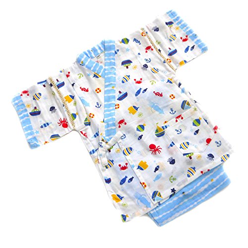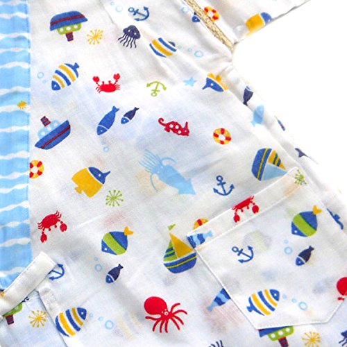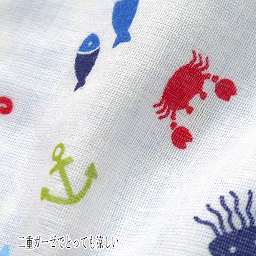 男の子 甚平 100cm 二重ガーゼ生地 白地 水色 青 夏 魚 船 イカリ タコ カニ
