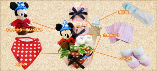 おむつもたっぷり46枚豪華な3段おむつケーキです。永遠の人気者ミッキーのぬいぐるみで可愛く仕上げた一品です!ふわふわのハンドタオルとスタイ、哺乳瓶、靴下も付いて納得の商品です。