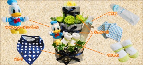 大人気キャラクタードナルドのぬいぐるみがアクセント!ふわふわのハンドタオル3枚と哺乳瓶、靴下、スタイと内容も充実!おむつもたっぷり46枚使用で豪華で可愛い一品です!男の子にも女の子にもピッタリです!
