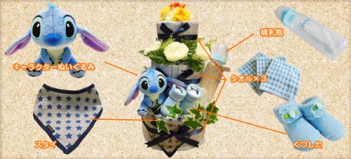 大人気キャラクタースティッチのぬいぐるみで可愛く仕上げました!おむつもたっぷり46枚使用。哺乳瓶や靴下、スタイ、何枚あっても重宝するふわふわのハンドタオル3枚も付いて内容充実!男の子にも女の子にも喜ばれる一品です!