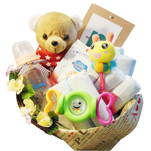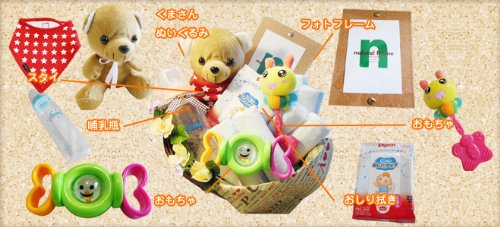 内容充実ながらもリーズナブル!くまさんぬいぐるみ、哺乳瓶、フォトフレーム、おもちゃ2個、スタイ、おしり拭きと内容充実です!見た目も可愛く豪華に!大人気の商品です!