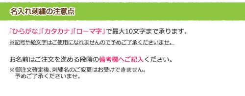 ※名入れ刺繍ありの商品をお選びになった場合は、ギフトメッセージ欄に、刺繍のお名前をひらがな・カタカナ・ローマ字のいずれか10文字以内にて記載くださいませ。