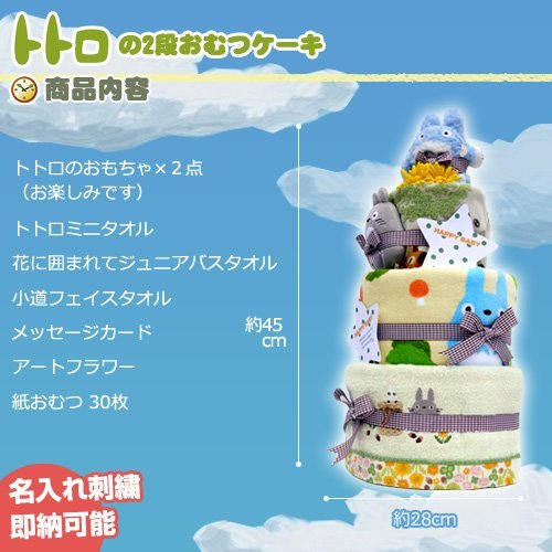 トトロ 名入れ刺繍 おむつケーキ おもちゃとタオル3枚付き 豪華3段 お楽しみ おむつけーき バス停 ミニタオル パンパースMサイズ となりのトトロ 大きいタオル(バスタオル フェイスタオル)