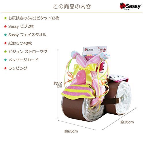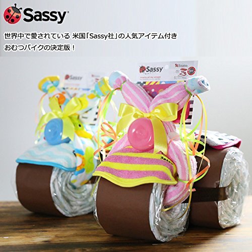 おむつバイク 出産祝い Sassy サッシー 名入れ刺繍 オムツバイク ビブ Bitatto ビタット タオル マグ おむつケーキ 手作り 豪華6点付 (パンパーステープタイプSサイズ, ブルー)
