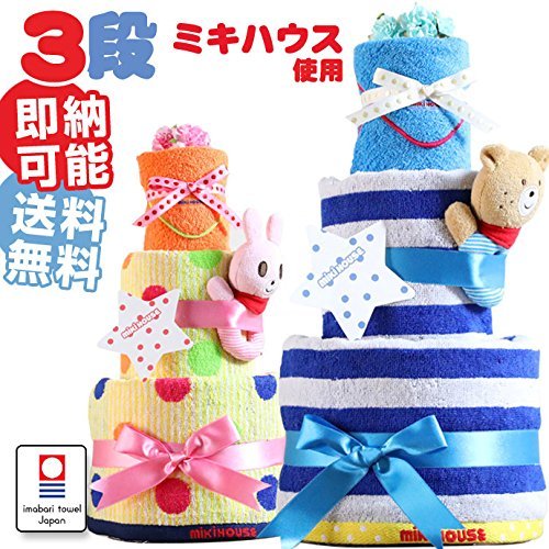 mikihouse(ミキハウス) 使用 おむつケーキ 出産祝い 名入れ刺繍 3段 オムツケーキ 今治タオル imabari towel (パンパーステープタイプMサイズ, ブルーのリボン 男の子向け)