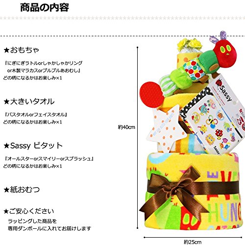 ★Amazon限定販売!はらぺこあおむしとSassyのコラボおむつケーキ★ ■商品サイズ:直径約25cm×高さ約40cm ■目安:Sサイズ(4-8kg) Mサイズ(6-11kg) Lサイズ(9-14kg)