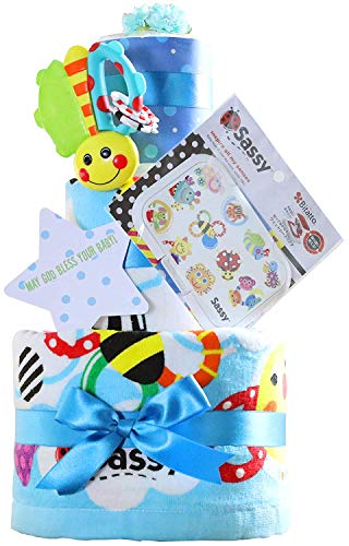 Sassy サッシー 出産祝い 身長計付き バスタオル 3段 おむつケーキ 名入れ刺繍 歯固め ビタット Bitatto メリーズテープタイプMサイズ 男の子用(ブルー系)