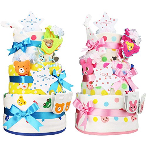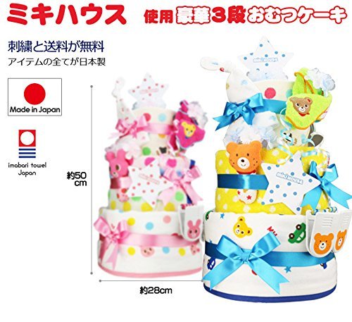 mikihouse(ミキハウス) 使用 出産祝い 日本製 超豪華3段 おむつケーキ 今治タオル imabari towel (パンパースパンツタイプLサイズ, 男の子向け(ブルー系))
