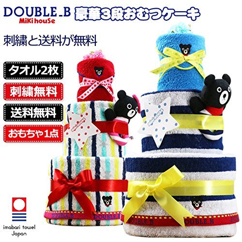 mikihouse(ミキハウス) DoubleB(ダブルビー) おむつケーキ 出産祝い 名入れ刺繍 3段 オムツケーキ 今治タオル imabari towel (パンパーステープタイプLサイズ, 男の子への贈り物)