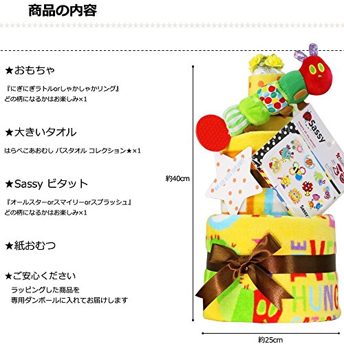 ★Amazon限定販売!はらぺこあおむしとSassyのコラボおむつケーキ★ ■商品サイズ:直径約25cm×高さ約40cm ■目安:Sサイズ(4-8kg) Mサイズ(6-11kg) Lサイズ(9-14kg)