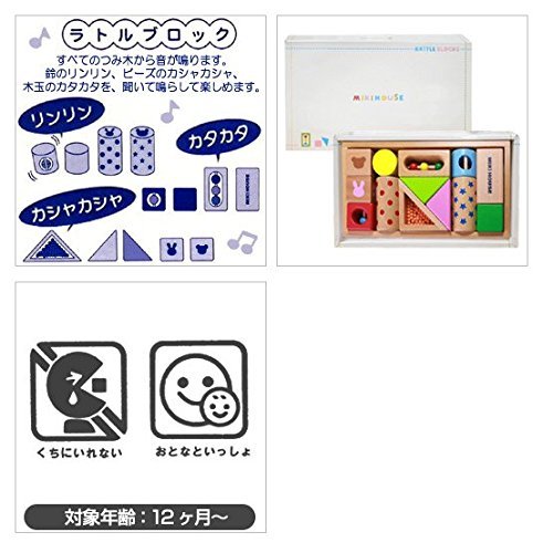音が鳴る可愛い積み木、ラトルブロックです☆ すべての積み木から音が鳴ります。鈴のリンリン、ビーズのカシャカシャ、木玉のカタカタを聞いて鳴らして楽しめます。 まだ上手に積み木を積めない時期も、振ったり転がしたりして音が鳴るので、楽しく遊んでいただけます。鮮やかなカラーリング・柔らかな木の質感が、赤ちゃんの五感を育みます。はじめての積み木デビューにオススメです。 ※CE(ヨーロッパの玩具安全基準) ※安全にお使いいただくために箱裏面の注意事項をご確認ください。また注意事項はいつでも参照できるように大切に保管してください。 ★★★送料無料★★★ミキハウス包装紙でラッピング済み★★★おむつケーキ研究所限定今治タオル(ウォッシュタオル)付き★★★ 出産祝いだけでなくお食い初めや初節句、バースデープレゼントや100日御祝い、内祝い、また、授かり婚・幸せカップルの方へのサプライズプレゼントにも是非★ ※ご留意ください※ アマゾンの仕様上、購入時にギフト設定を行わなかった場合は金額等が判明する明細が同封されてしまいます。直接お届けを行なう際にはご注意いただけますようお願い申しあげます。 ※今治タオル(ウォッシュタオル)は商品に同梱しておりますのでご安心いただけますようお願い申しあげます