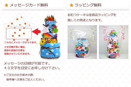 ▼紙おむつのメーカーと枚数 「パンパース」or「ムーニー」or「グーン」×23枚 おむつのサイズはS,M,Lからお選びいただけます ※Mサイズやをお選びの場合20枚 ※Lサイズやパンツタイプをお選びの場合18枚 ☆目安☆ Sサイズ(4-8kg) Mサイズ(6-11kg) Lサイズ(9-14kg) ▼おむつケーキのサイズ 直径約25cm×高さ約40cm ▼このおむつケーキの装備アイテム ■今治 バスタオル 桜美織 ■今治 ウォッシュ・タオル 桜美織 ■オーガニックコットンのガラガラ ■メッセージカード ■アートフラワー