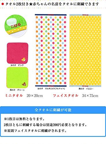 - 【セット内容】ミニタオル ピンク×1※名入れ刺繍追加で可能 フェイスタオル マルチ(カラフルドット)×1※期間限定今だけ刺繍無料(希望の場合は『刺繍 ○○』とギフトメッセージ欄に「ひらがな・カタカナ・ローマ字のいずれか10文字以内」で記載ください)