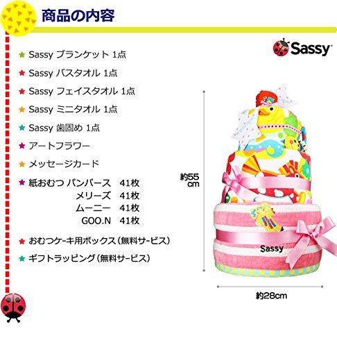 ★商品の詳細 ●紙おむつのメーカーと枚数おむつの種類● 「パンパース」「ムーニー」「メリーズ」「GOO.N」のいずれかで41枚 おむつのサイズはS,M,Lからお選びいただけます。 ※Mサイズ選択時は30枚 Lサイズ選択時は25枚 ※パンツタイプはM・Lいずれも21枚 ●おむつケーキの サイズ● 直径約28cm×高さ約55cm ●目安● Sサイズ(4-8kg) Mサイズ(6-11kg) Lサイズ(9-14kg)