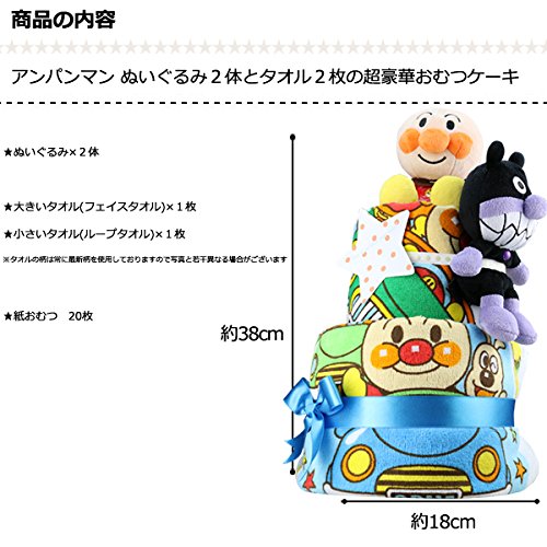 出産祝い アンパンマン ぬいぐるみ2体とタオル2枚の超豪華 2段 おむつケーキ パンパースS おもちゃ 男の子向け ばいきんまん