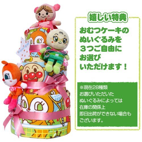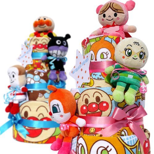 ★商品の詳細 ●紙おむつのメーカーと枚数おむつの種類● 「パンパース」「ムーニー」「メリーズ」「GOO.N」のいずれかで41枚 おむつのサイズはS,M,Lからお選びいただけます。 ※Mサイズ選択時は30枚 Lサイズ選択時は25枚 ※パンツタイプはM・Lいずれも21枚 ●おむつケーキの サイズ● 直径約25cm×高さ約40cm ●目安● Sサイズ(4-8kg) Mサイズ(6-11kg) Lサイズ(9-14kg) 【選べるぬいぐるみ3種類】 アンパンマン あかちゃんまん ばいきんまん メロンパンナ しょくぱんまん カレーパンマン ジャムおじさん ドキンちゃん コキンちゃん アンパンマン号 めいけんチーズ おむすびまん かつどんまん てんどんまん バタコさん クリームパンダ ハンバーガーキッド もぐりん SLマン ホラーマン ナガネギマン かびるんるん かばおくん だだんだん ロールパンナ てっかのマキ かまめしどん こむすびまん ▲上記より3つお選びいただきメッセージ欄にお書きください。 (メッセージがある場合はメッセージの語尾、もしくはメールにてお問い合わせくださいませ) ☆別途刺繍チケット購入でタオルへの名入れ刺繍も可能(お気軽にお問い合わせくださいませ)※チケット1枚購入でタオル一枚に刺繍可能 ※お選びいただいたぬいぐるみによっては在庫の関係上、即日発送が出来ない場合もございますので、あらかじめご了承いただくようよろしくお願い申し上げます。